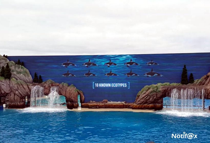 Apoyado con una pantalla de alta resolución del tamaño de un estadio de futbol, se proyectan escenas del comportamiento natural de los mamíferos y una escenografía del Norte del Pacífico. Durante 22 minutos Orca Encounter muestra al público el comportamiento de las orcas en su hábitat natural, los 10 ecotipos de orcas, el por qué de sus colores, características físicas, formas de comunicación, cómo cazan, su tamaño, cómo aprenden, cómo juegan, cómo los cuidan y lo que han aprendido de ellas; además de despertar un sentido de determinación y propósito para ayudar a preservar el futuro de estos majestuosos animales.